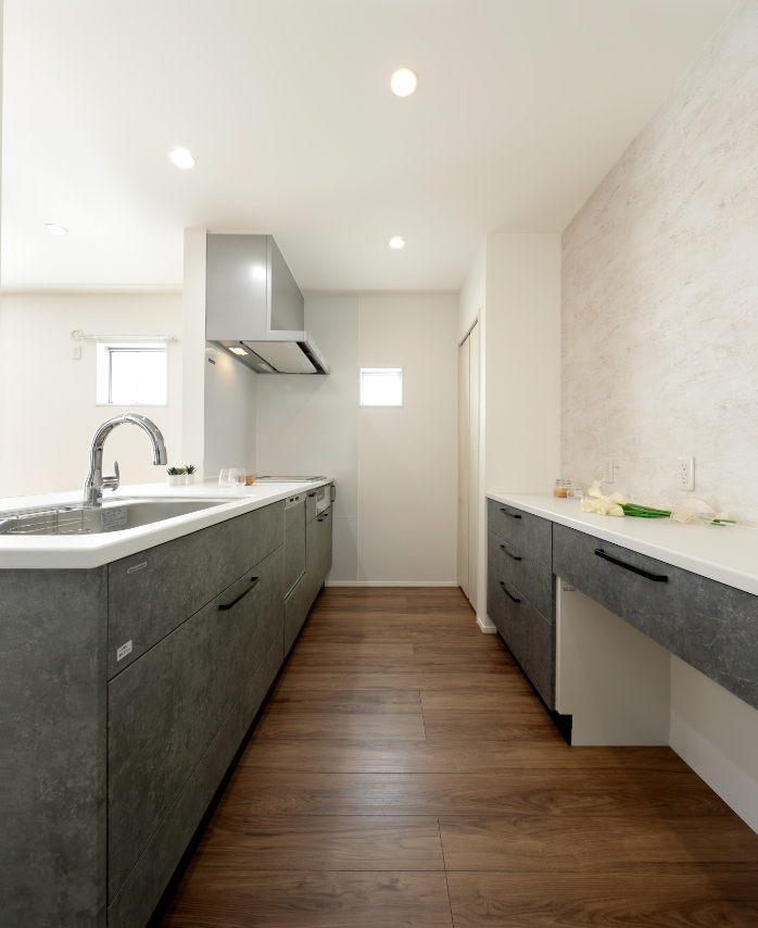 LDK全体の統一感を高め、毎日立つ場所だからこそ、飽きのこないデザインに仕上げています。