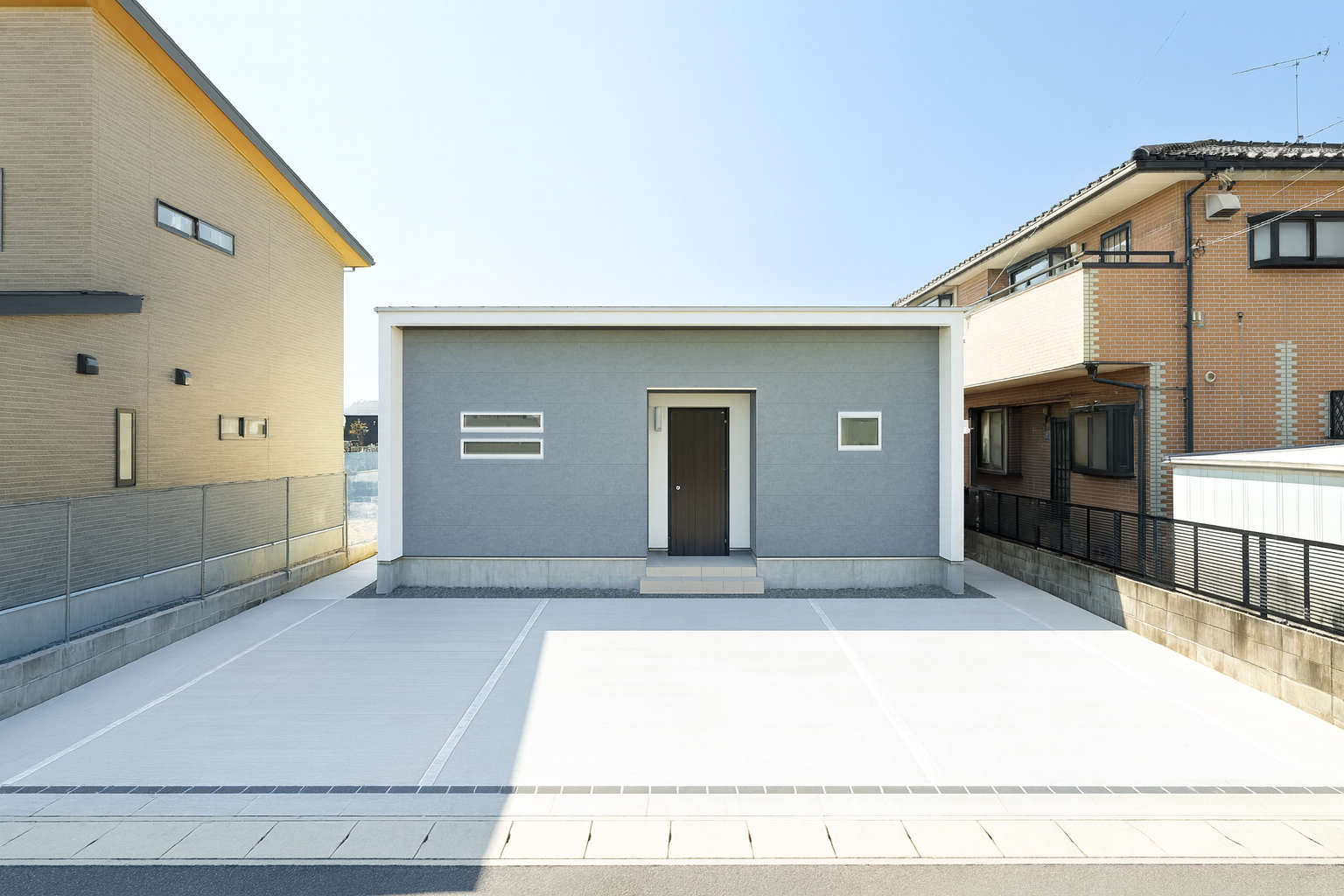 平屋ならではの低く安定したフォルムと相まって、街並みに自然と馴染む佇まいに仕上がっています。